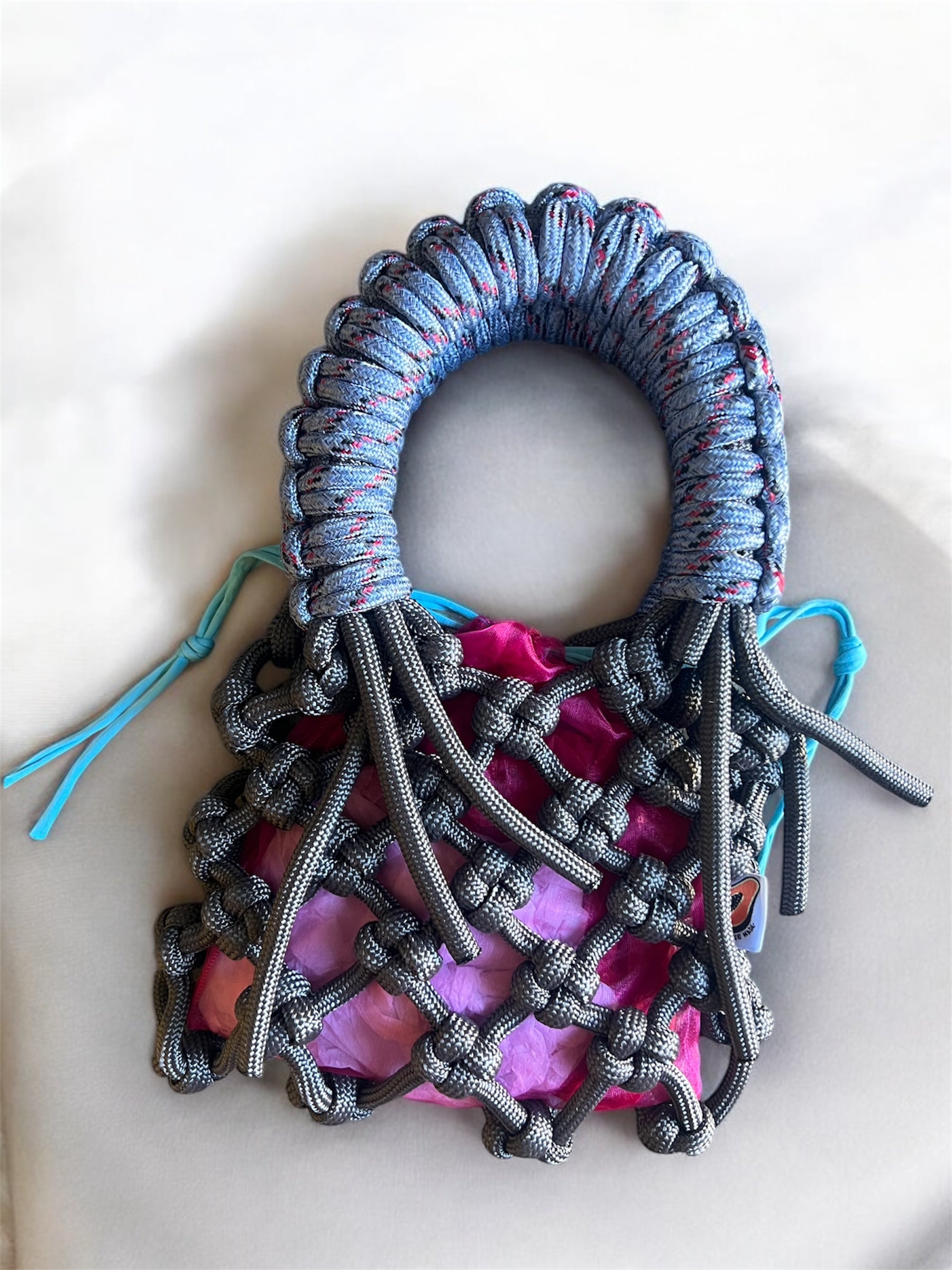 Handmade macrame rope bag. Blue handle with Charcoal rope bag and pink drawstring