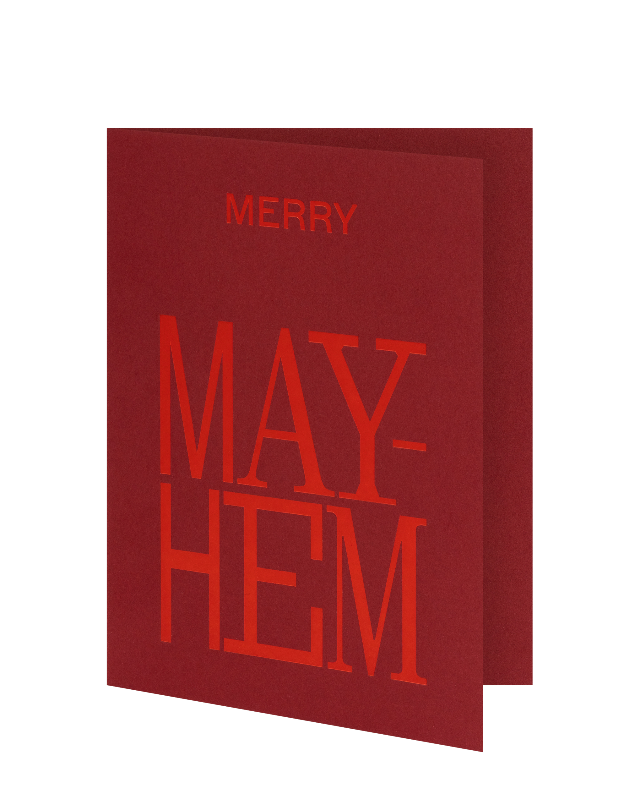Because 'tis the season for merriment and MAYHEM. Made from a thick berry-toned stock, and letter pressed in a poppy red foil. Bright and bold, much like Christmas! Blank inside, ready for your cheer.
